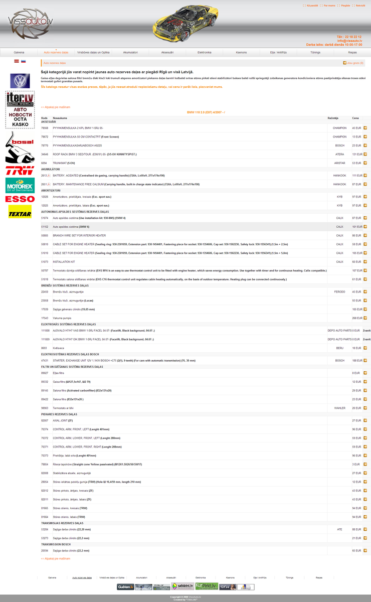Interneta veikals auto daļām un aksesuāriem. Veikals piedāvā ļoti plašu dažādu kategoriju preču klāstu, tādēļ tika izveidota sistēma atsevišķu parametru piesaistei vajadzīgajai kategorijai. Preces var pievienot manuāli, kā arī izmantojot MS Excel failu. Dažas preču kategorijas tiek atjaunotas automātiski ar XML palīdzību. Ja sistēmā parādās divi vienādi produkti no dažādiem piegādātājiem, tad sistēma pati izvēlas optimālāko produktu, vadoties pēc cenas.