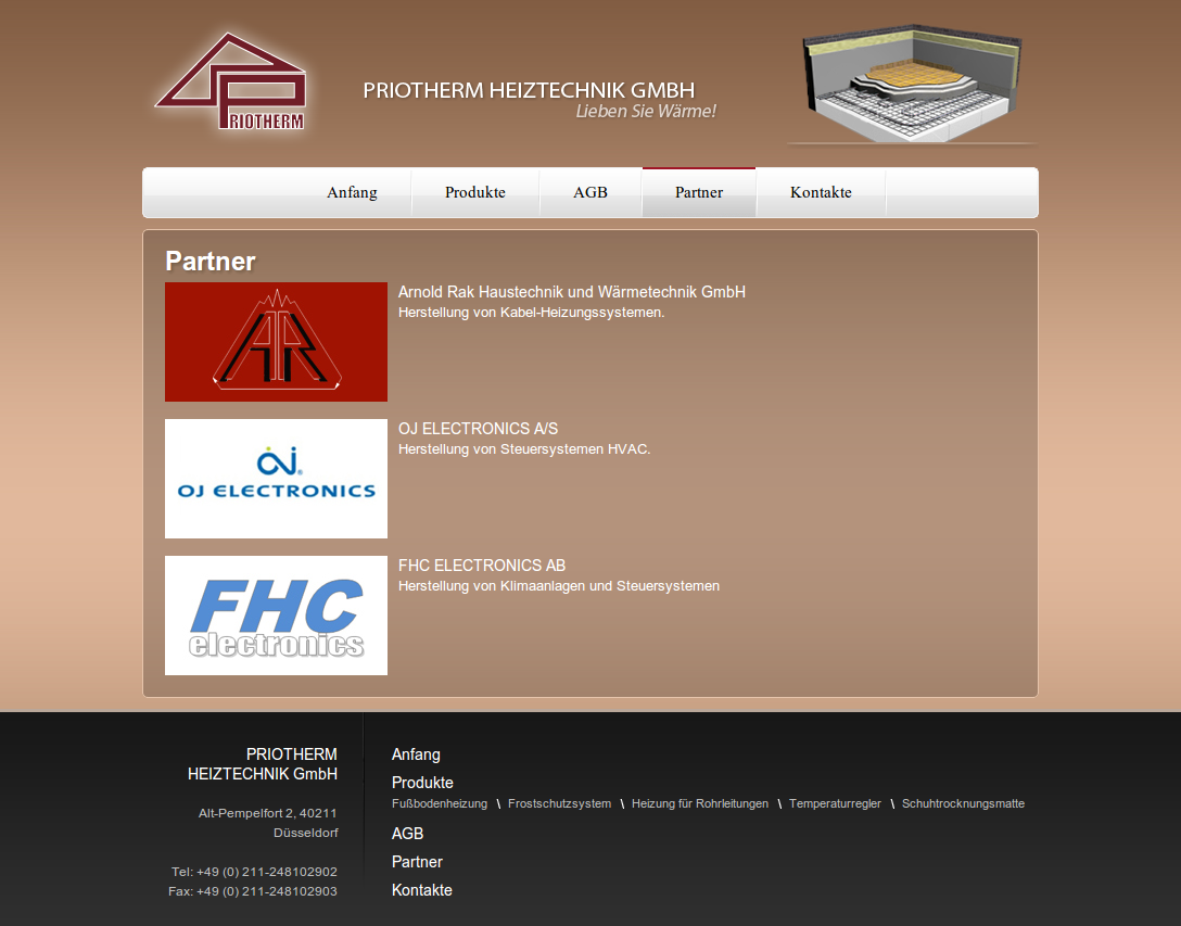 PRIOTHERM firmas mājas lapa. Lapa tika veikta Vācijas tirgum. PRIOTHERM nodarbojas ar siltā grīdām. Lapā tiek sniegta informācija par firmas padodamo produkciju, cenas, kā arī cita teksta informācija. Projekts bija īstenots PHP valodā. Projektā ietvaros bija uzrakstīts klienta vajadzībām piemērots administrācijas panelis (CMS).