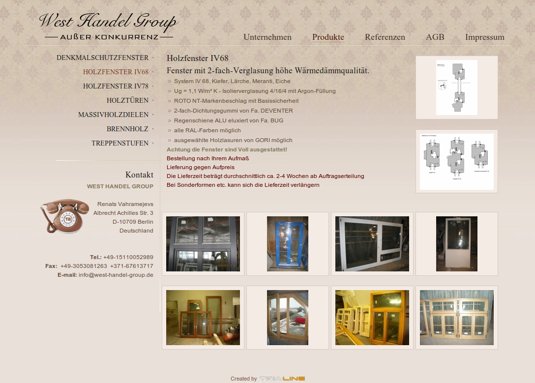 West Handel Group firmas mājas lapa. Lapa tika veikta Vācijas tirgum. West Handel Group nodarbojas ar logu izveidošanu. Lapa rada darba piemērus un kontakt informāciju. Projekts bija īstenots PHP valodā. Projektā ietvaros bija uzrakstīts klienta vajadzībām piemērots administrācijas panelis (CMS).